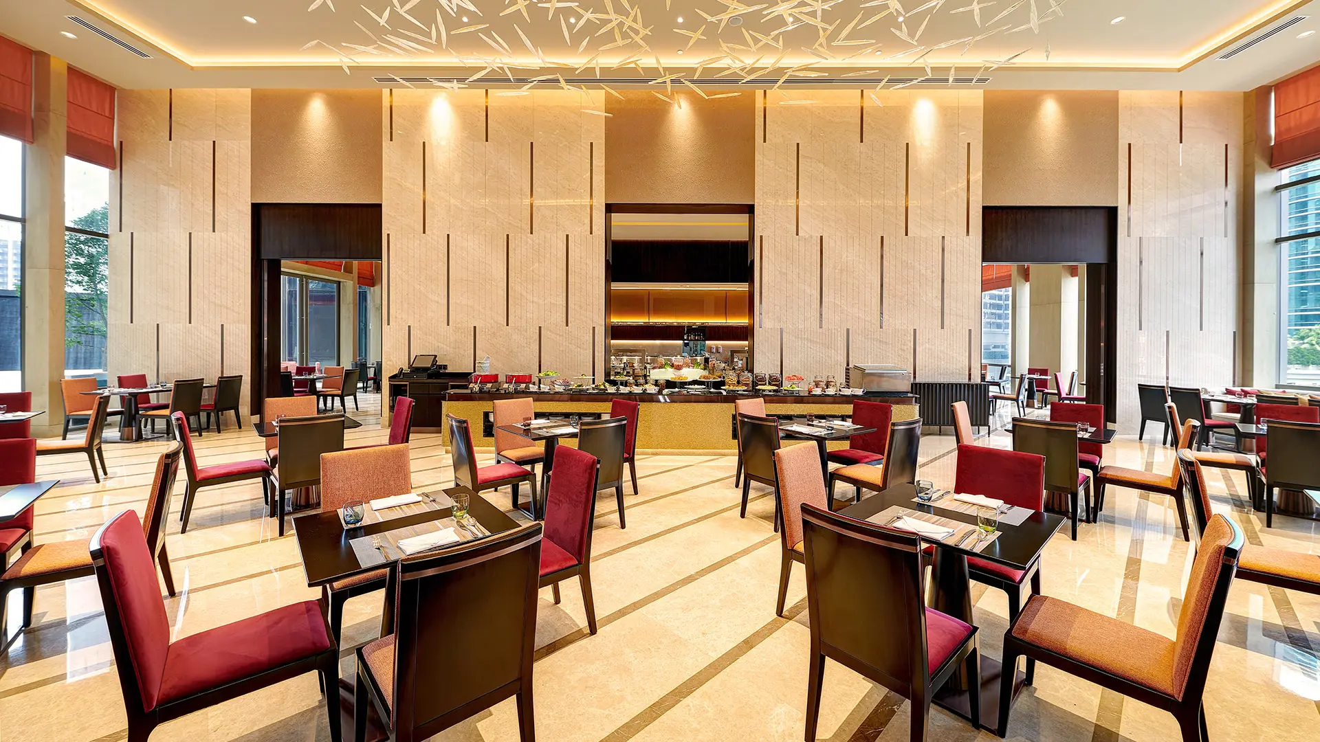 The hall exudes spacious elegance: Tall stone-clad walls and a soaring ceiling (adorned with a sculptural, leaf-like light installation) create an airy ambiance. Vibrant red and amber seating adds warmth to the neutral palette, while large windows flood the space with natural light—making it ideal for both intimate meals and grand gatherings.