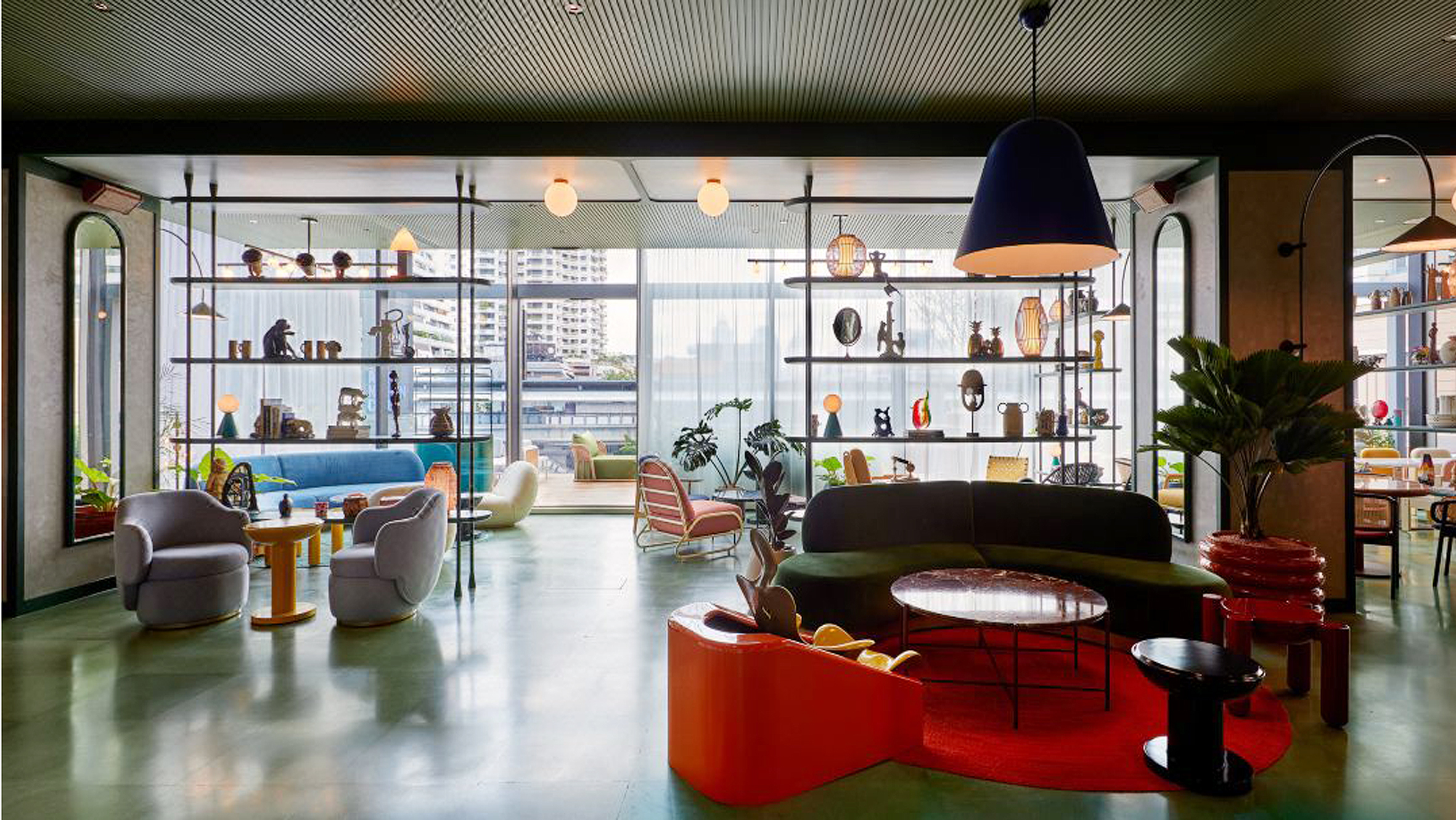 Other public areas, like the lounge spaces, are equally impressive. They are filled with a variety of colorful, uniquely designed furniture pieces. The mix of modern and artistic elements, such as the eclectic display of ornaments on shelves, makes these areas perfect for socializing or simply relaxing while admiring the stylish decor.